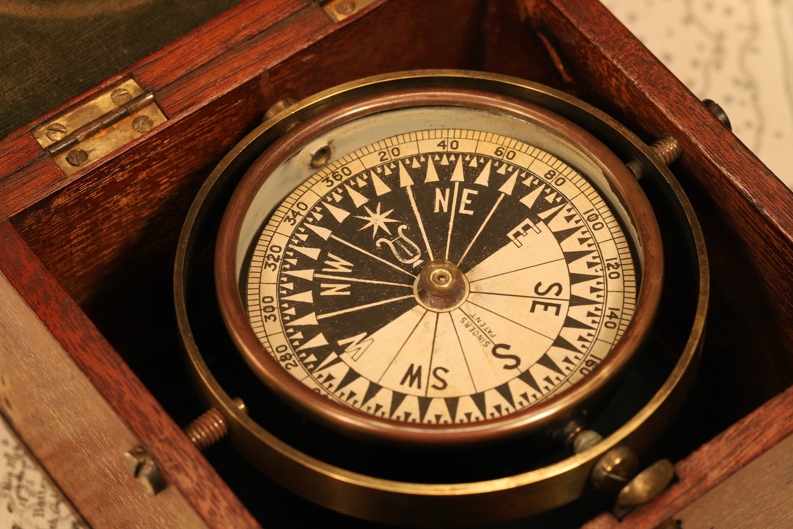 Nautical dry card compass having 2½″ diameter hand drawn Singer Patent dial displaying cardinals and intercardinals, Singer trademark star and lyre indicating north, and outer scale 0°-360°. Card suspended on jewelled pivot, the verso with magnetic needle, balanced with sealing wax. All within a white painted brass bowl, japanned to outside, set on lacquered brass gimballed mountings and contained within a velvet lined hardwood, probably teak, case, brass hinges and push button release.