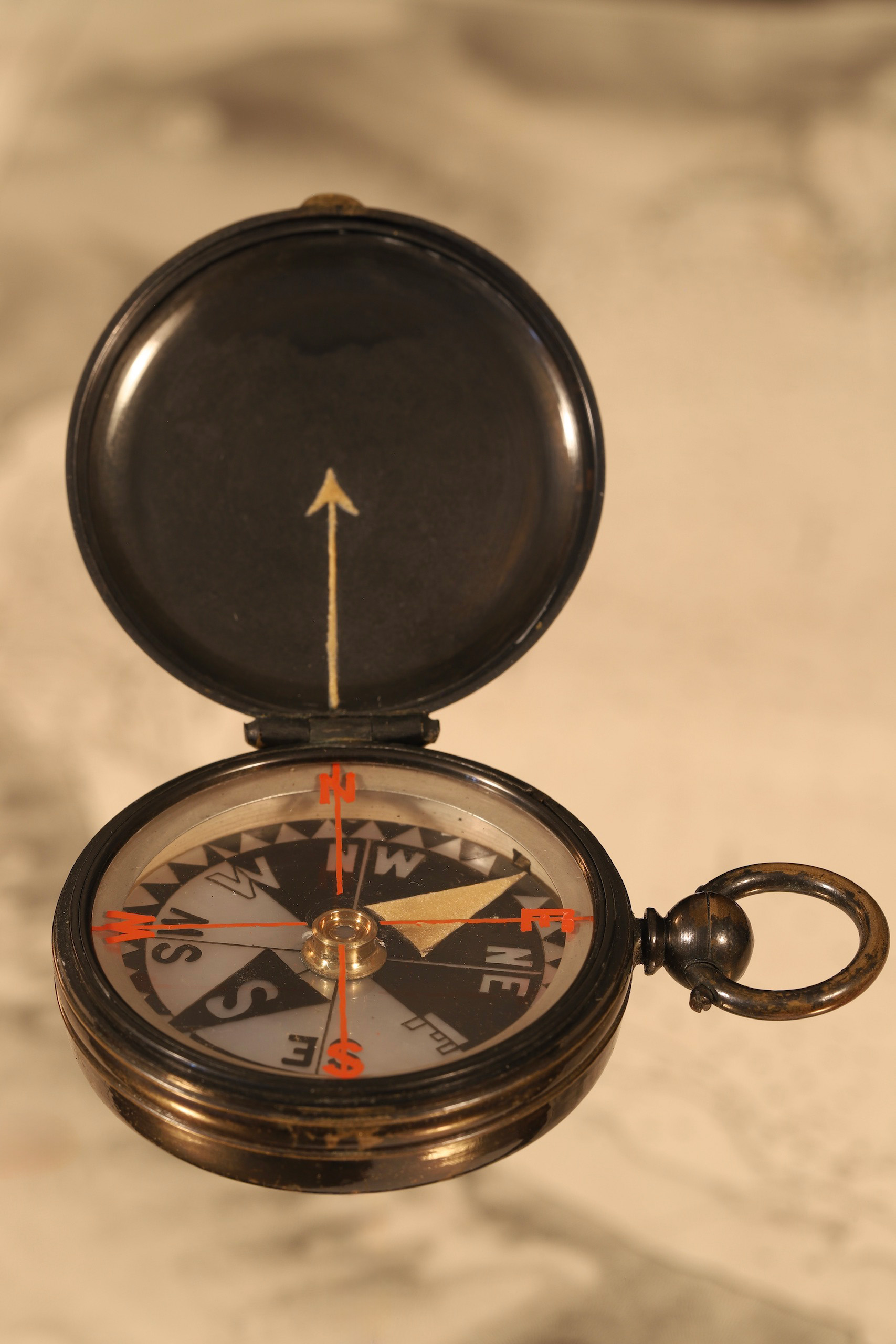 Antique pocket compass having 1¾” mother of pearl floating hand-drawn Singer pattern card displaying cardinals and intercardinals, divided to 10°, north indicated by a large triangle. The card suspended on an agate, under flat glass with hand painted red lubber lines and cardinals to verso.