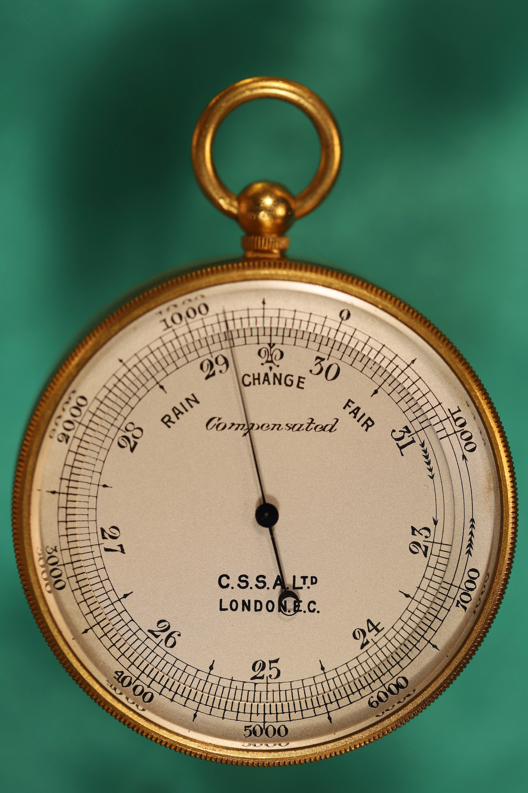 Pocket barometer having 1¾” silvered and die struck dial, outer bezel operated altitude ring calibrated in feet with ascending and descending scales calibrated in feet divided to 50ft with ranges 0 to 7,000ft, and 0 to -1,000ft respectively. The barometric scale calibrated in inches of mercury with a range from 23” – 31” divided to 1/20”, the upper part with standard meteorological terms and marked “Compensated,” the lower part carrying the retailer’s details “C.S.S.A. Ltd, London. EC.” Blued steel pointer, bevelled glass.