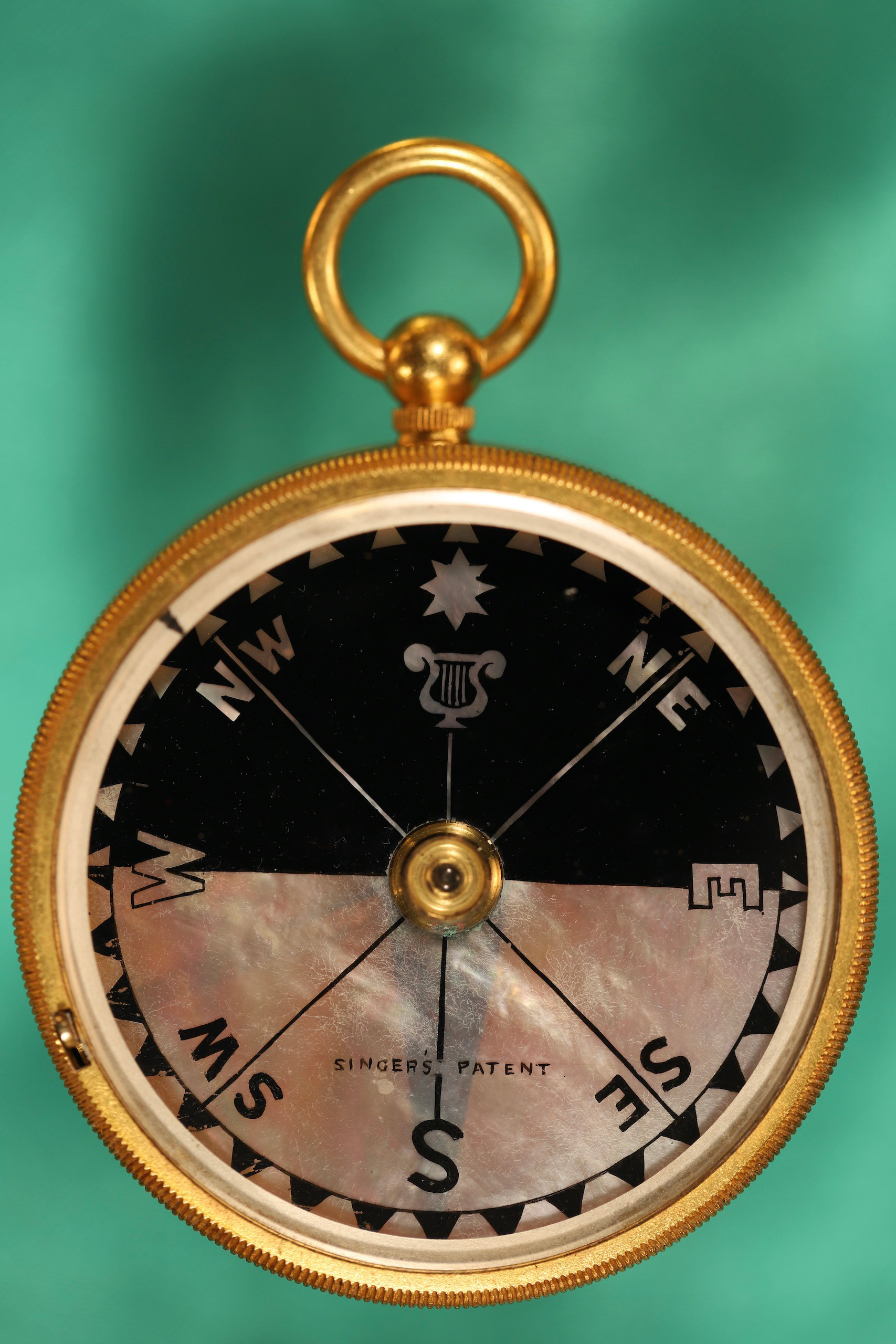 The detachable pushfit compass having 1¾” hand decorated mother of pearl floating card marked “Singer’s Patent,” with cardinals and intercardinals, Singer’s trademark star and lyre to north. Gemstone suspension, compass lock to periphery.