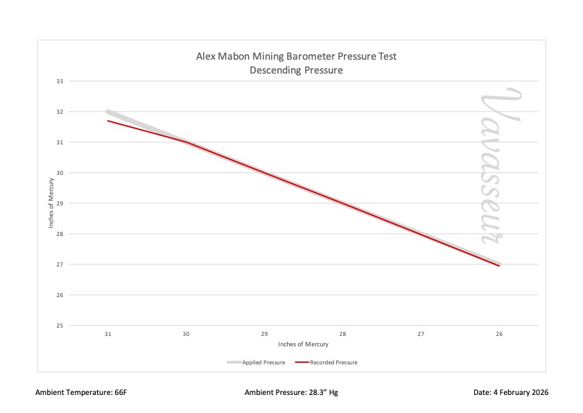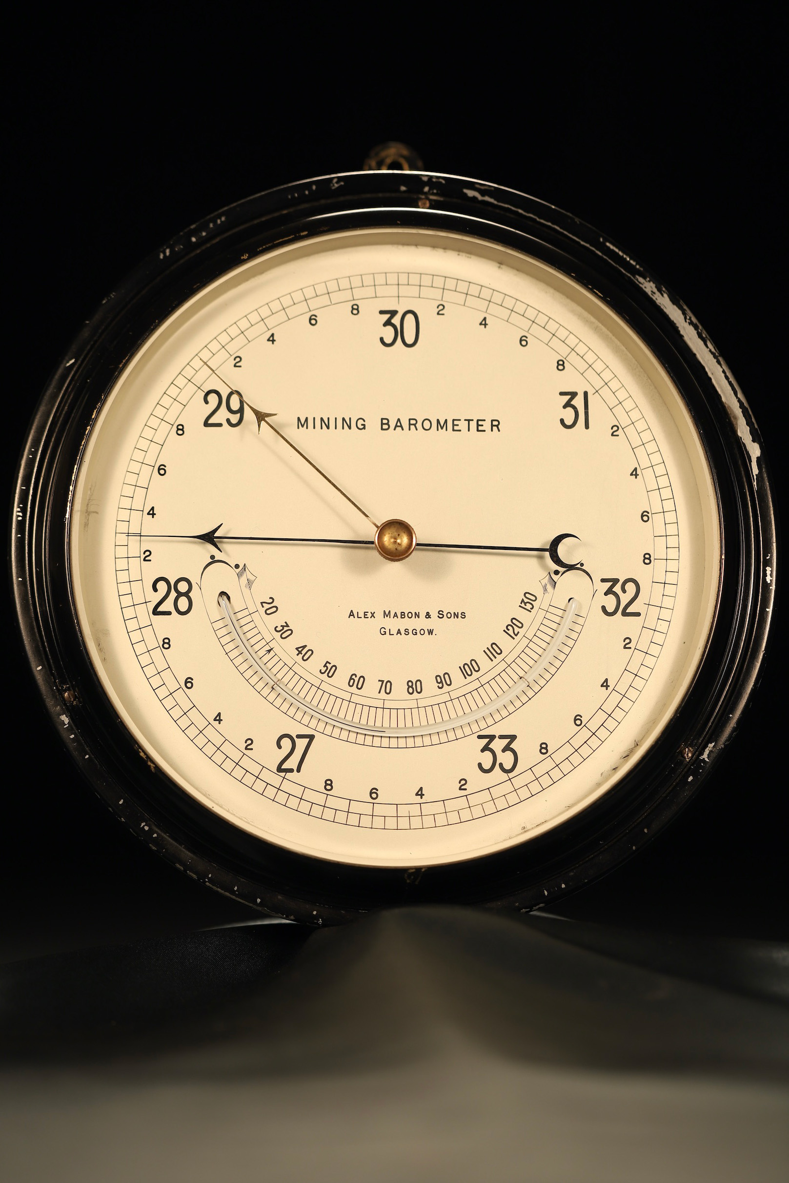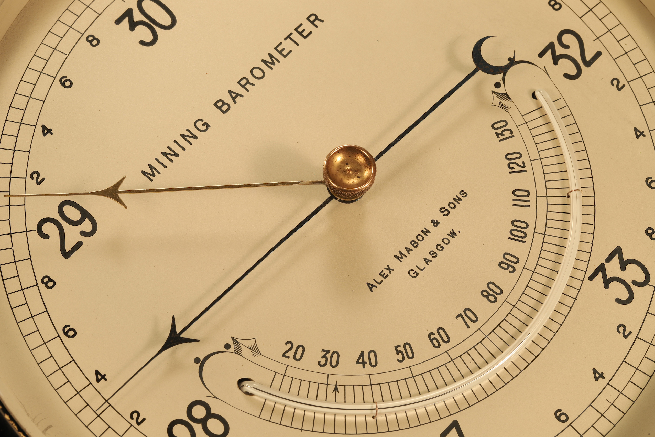Mining Aneroid barometer having 7½” silvered and machine engraved dial, the barometric scale calibrated in inches of mercury with a range from 27” – 33” divided down to 1/20”, the upper part marked “Mining Barometer,” the lower signed by the retailer “Alex Mabon & Sons, Glasgow.” Silvered reflector ring. Semi circular thermometer calibrated in degrees Fahrenheit, with a range from 20° – 130° divided to 2°. Blued steel pointer and lacquered brass index under bevelled glass.