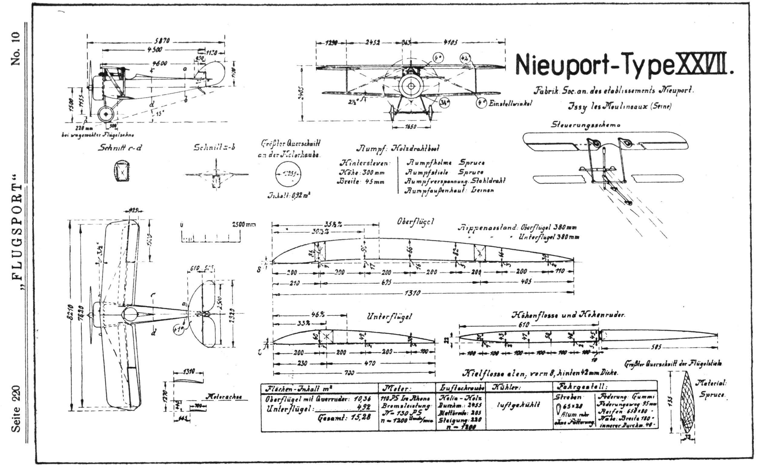 When I first became aware of what this item was, I contacted Shuttleworth Museum who said they had never seen anything like it and that the remaining original rib looked very much like that of a 1912 Blackburn Monoplane. Somewhere in the conversation a Nieuport Type XXVII was also mentioned. I include a schematic from a period publication, “Flugsport,” of this second aircraft, and the similarities in section are quite compelling. The original rib may not in fact have been a model of any specific wing section though looking at the subtleties of its form I would suggest that it was taken from a full scale drawing.