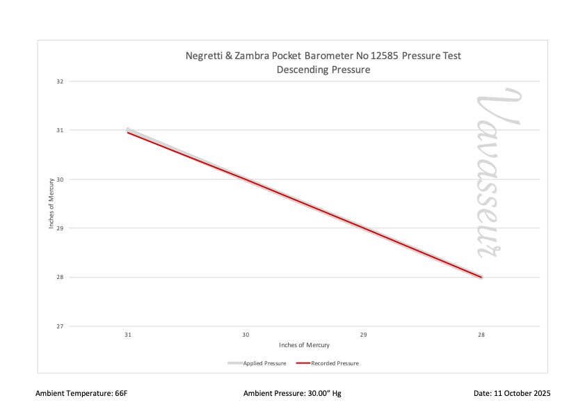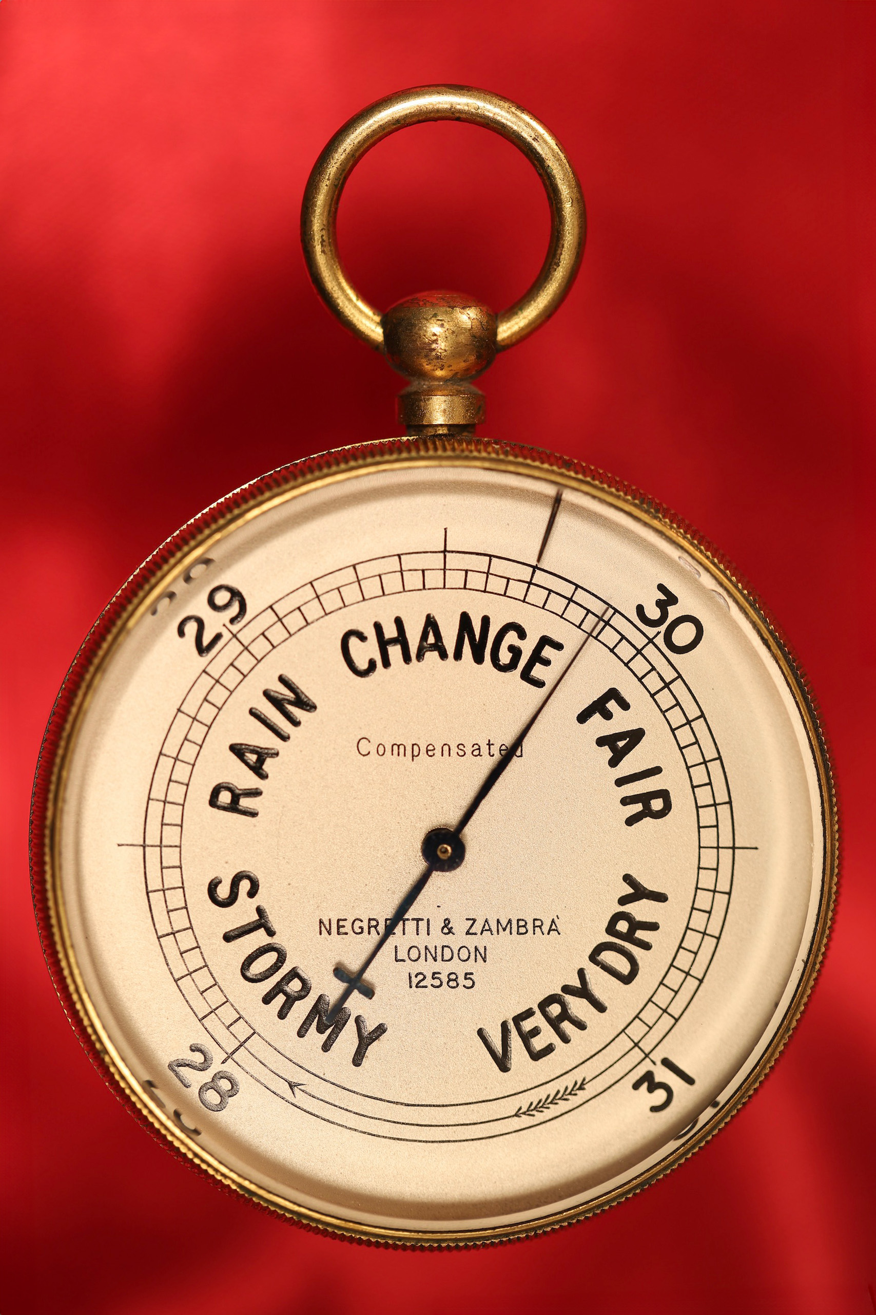 Pocket barometer having 1¾” silvered and die struck dial, the barometric scale calibrated in inches of mercury with a range from 28” – 31” divided to 1/20”, the upper part marked “Compensated,” the lower signed by the maker “Negretti & Zambra, London,” and serial number “12585.” Fine tapered blued steel pointer, bezel set barb index, bevelled glass.