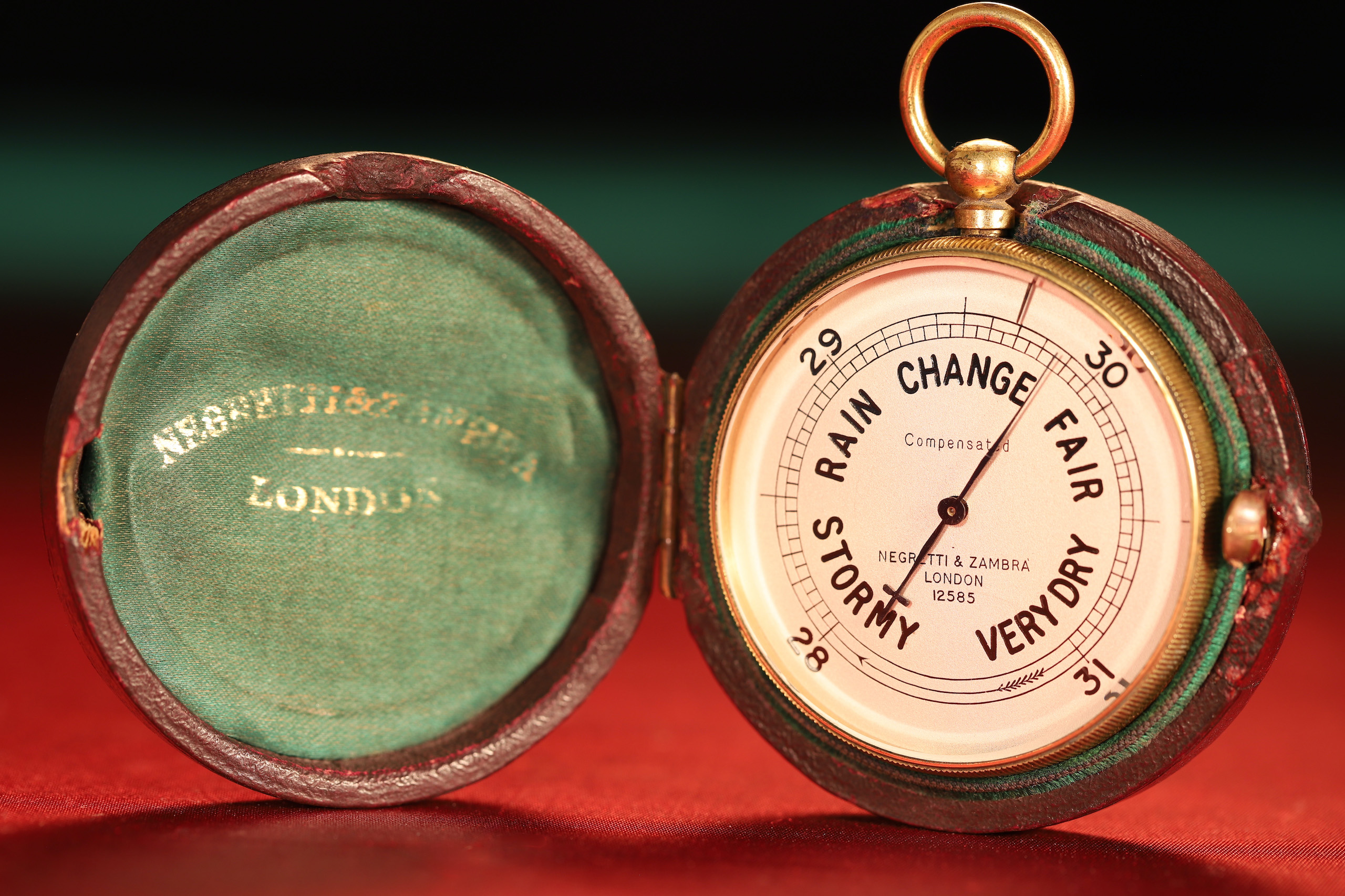 Presented in its original burgundy leather over timber, green silk and velvet lined case, “Negretti & Zambra” logogram to inner lid. Snap closure on a button release.