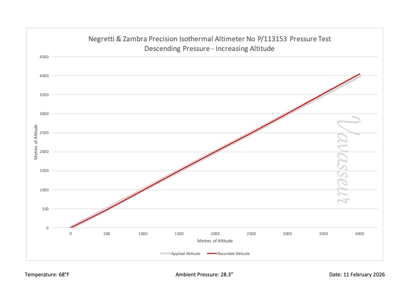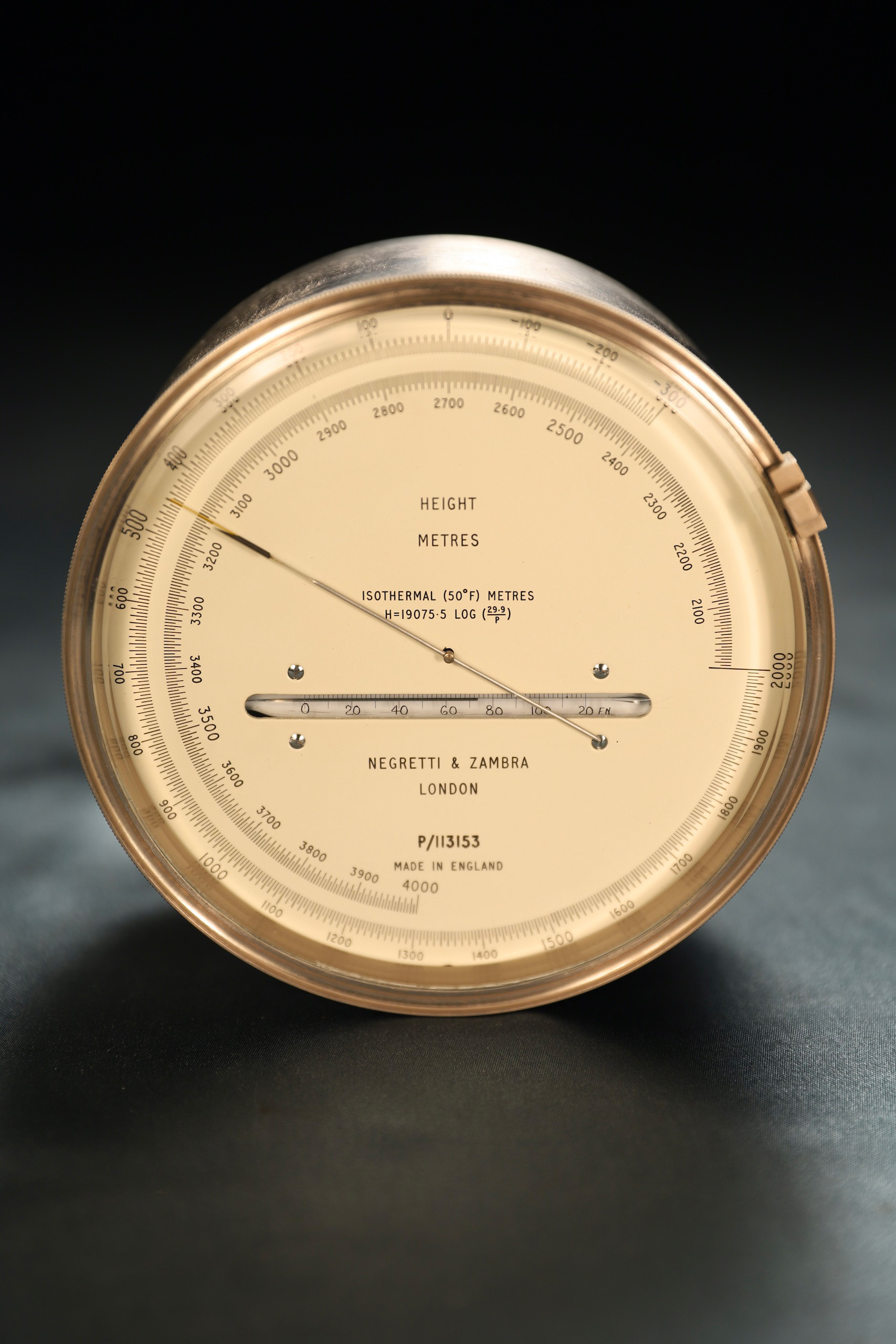 Aneroid altimeter having 4¾” off white enamelled dial calibrated in metres of altitude and finely divided to 5m, the upper part marked “Height,” “Metres” and “Isothermal (50°F) Metres, H=19075.5 Log (29.9/P),” the lower signed by the maker “Negretti & Zambra, London,” and serial no. “P/113153.” Straight thermometer calibrated in degrees Fahrenheit with a range from 0°-120°. Light weight tubular aluminium knife pointer, bevelled glass set within a rotating bezel.