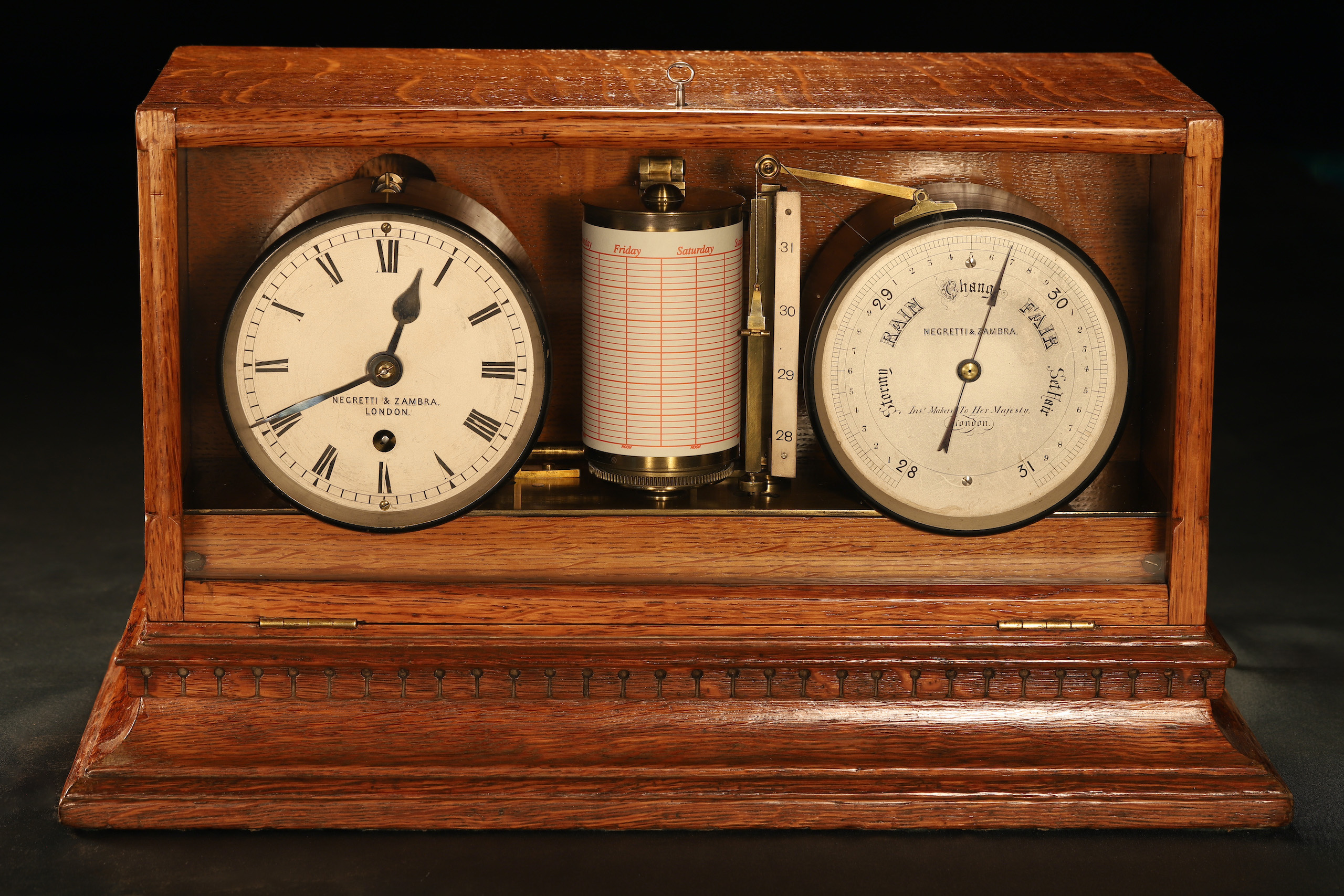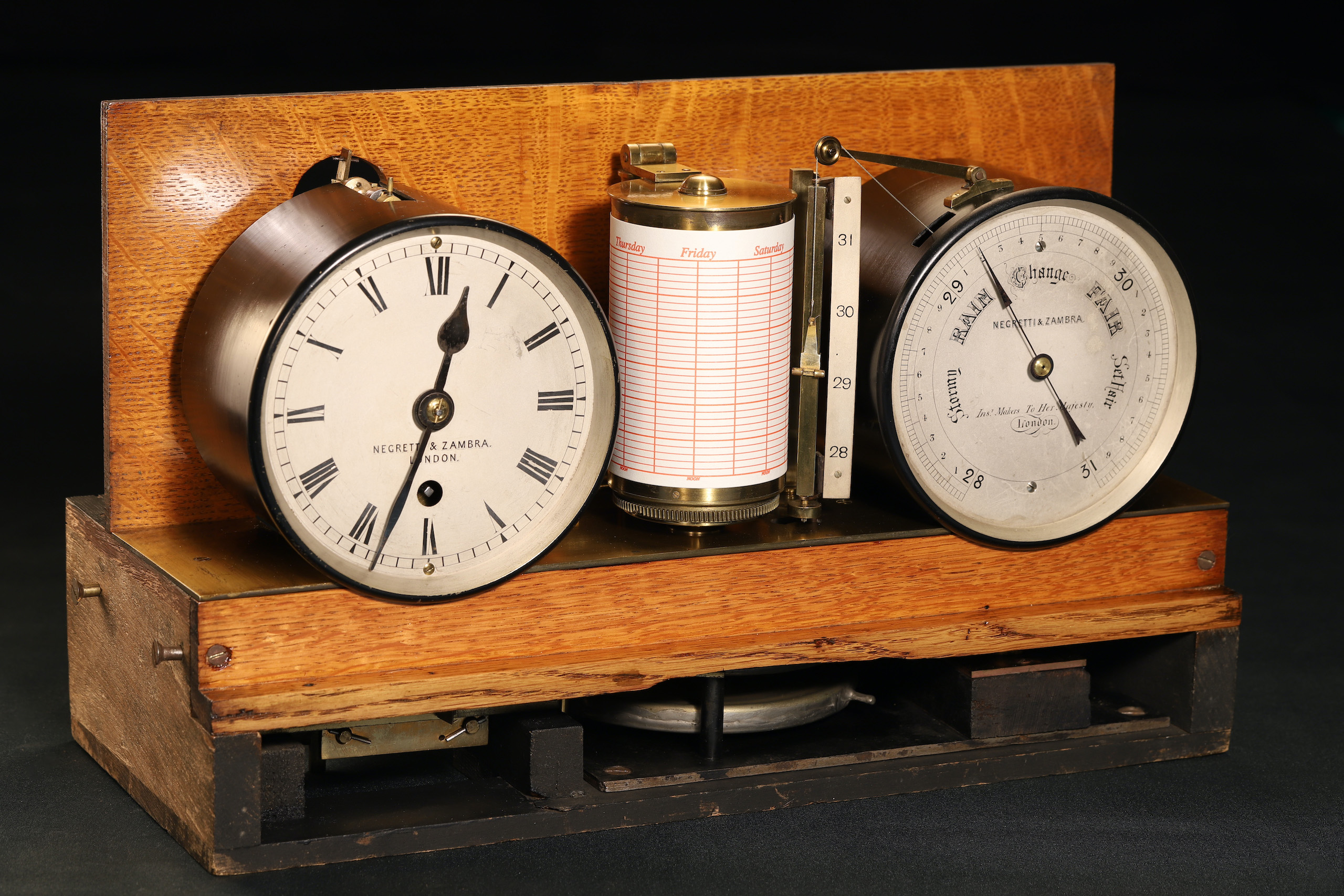 Weather station comprising 8 day chain fusee clock with deadbeat escapement, the 4½” silvered dial marked with Roman numerals, spade hands, aperture with winding square, the lower part signed by the maker “Negretti & Zambra.” Actuators for barometer prompt and barograph registration system, worm and wheel drive to barograph drum. Mounted within a drum form Japanned shroud.