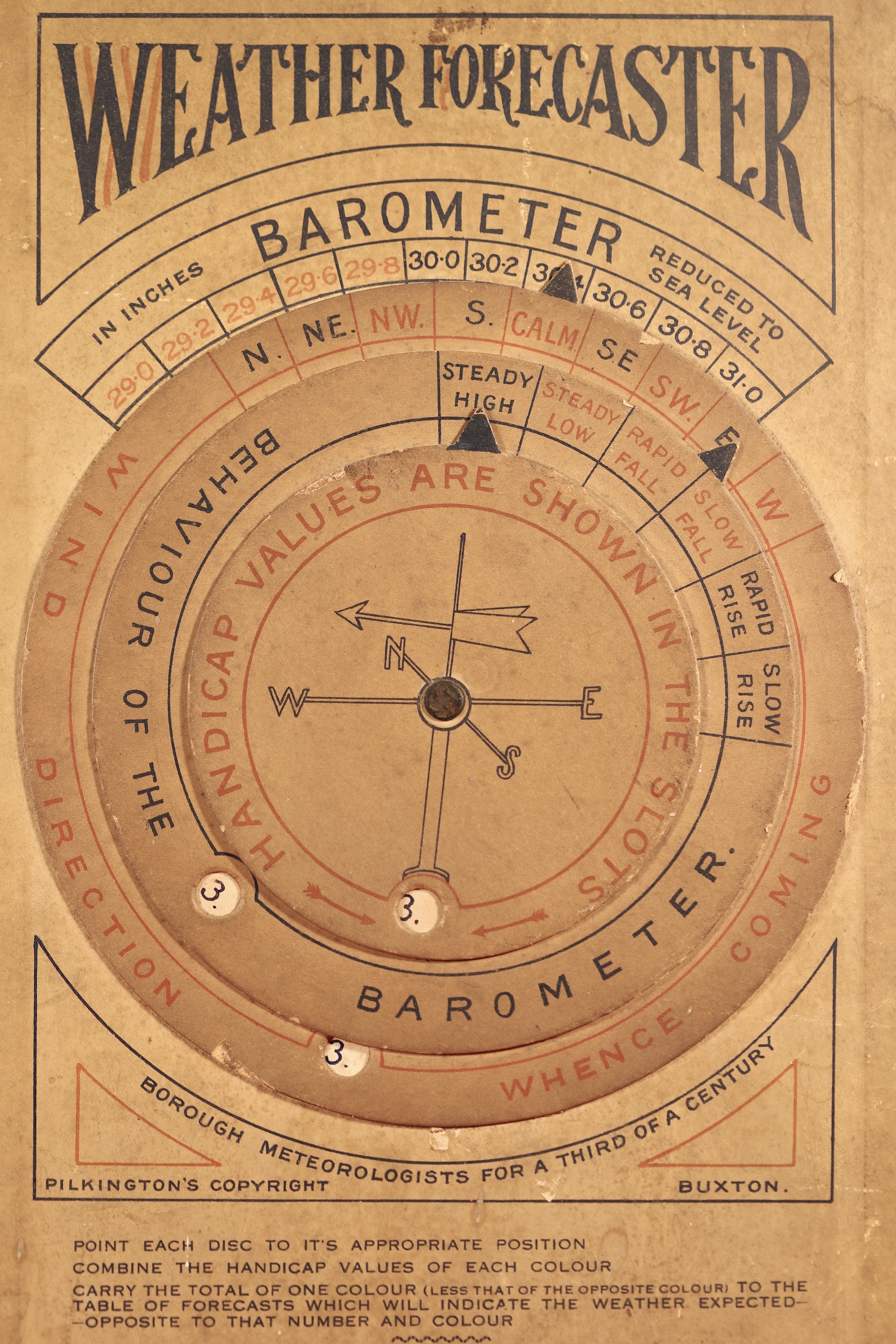 Printed card Weather Forecaster comprising curved barometric scale to top part with a range from 29.0” to 31.0”, 29.0”-29.8” in red, 30”-31” in blue, divided to 0.2”, and marked “Reduced to Sea Level.” Under this, three concentric rotating rings set to centre: the outer marked “Wind Direction Whence Coming,” and showing wind directions; the middle ”Behaviour of the Barometer;” the inner “Handicap Values are Shown in the Slots.” These three rings are also in red and blue, dependent on the option selected, and each has a circular aperture behind which are the numbers 1-3 in both red and blue.