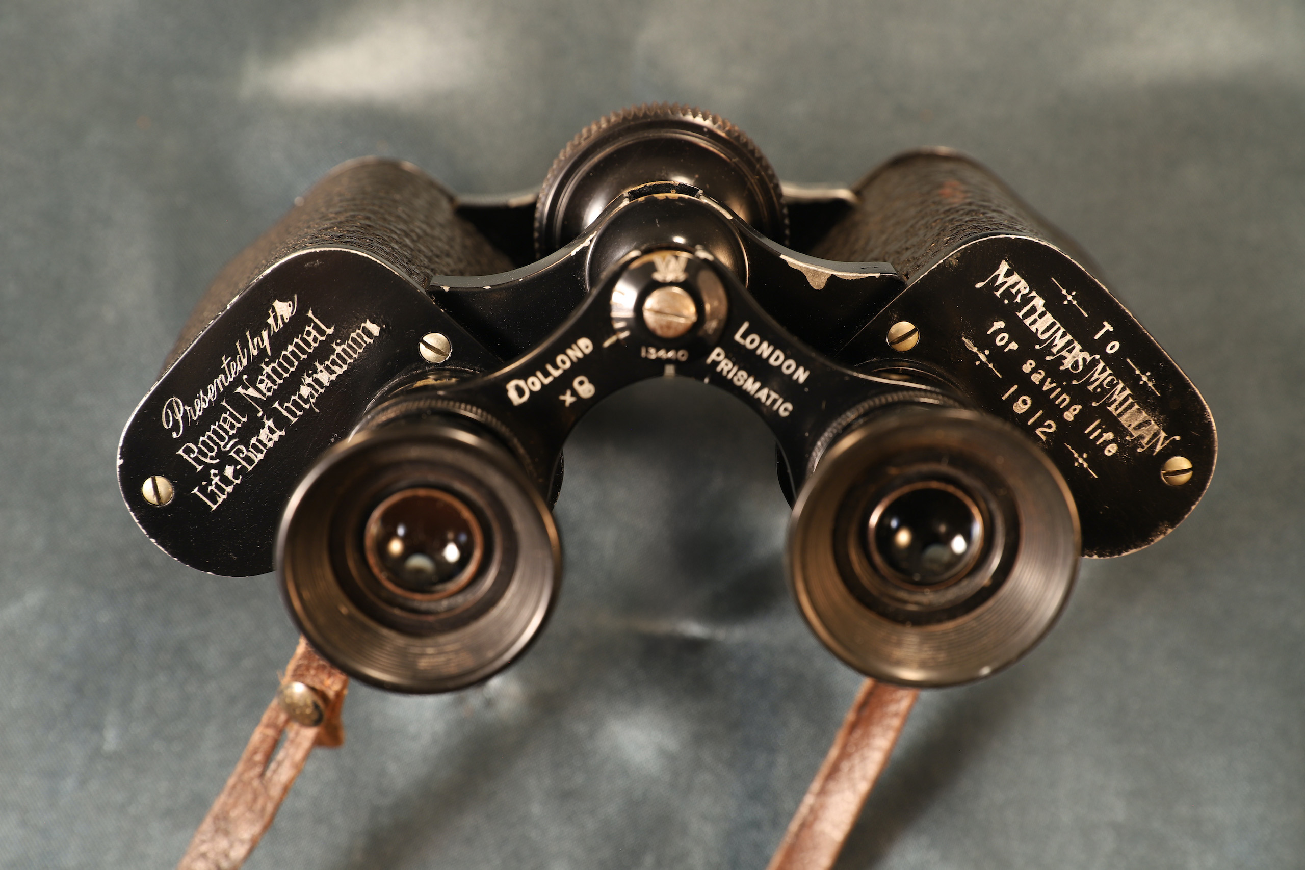 An interesting set of prismatic binoculars by Dollond awarded by the RNLI to Mr Thomas McMillan in 1912