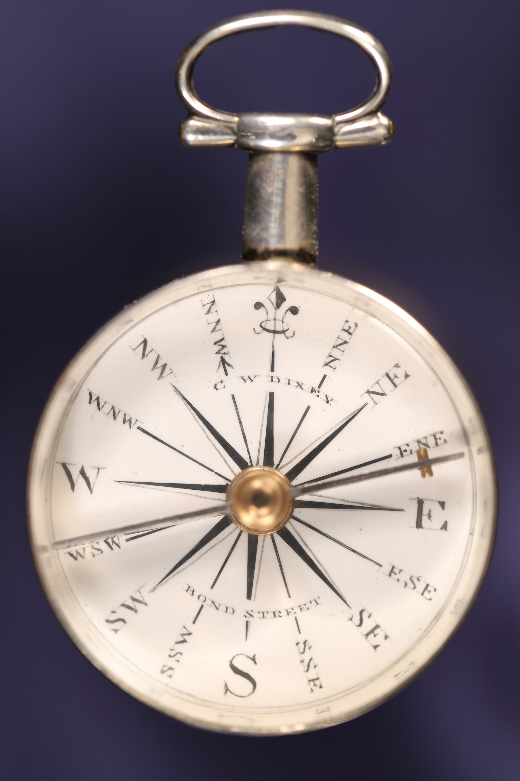 A very high quality, 1¼” diameter silver pocket compass having enamelled dial with hand painted cardinals, intercardinals and false points, fleur de lys for north, small arrow indicating magnetic north at the time. The upper centre marked with the retailer, “C.W. Dixey,” the lower centre with address “Bond Street.” Polished flat steel bar needle with jewelled suspension, highly-polished silver reflector ring, low dome crystal. Silver drum form case, long necked suspension post and Georgian pattern bow with transit lock button behind. The verso with hallmarks for James Simms & George Simms, London and 1842. Separate silver push-fit lid.