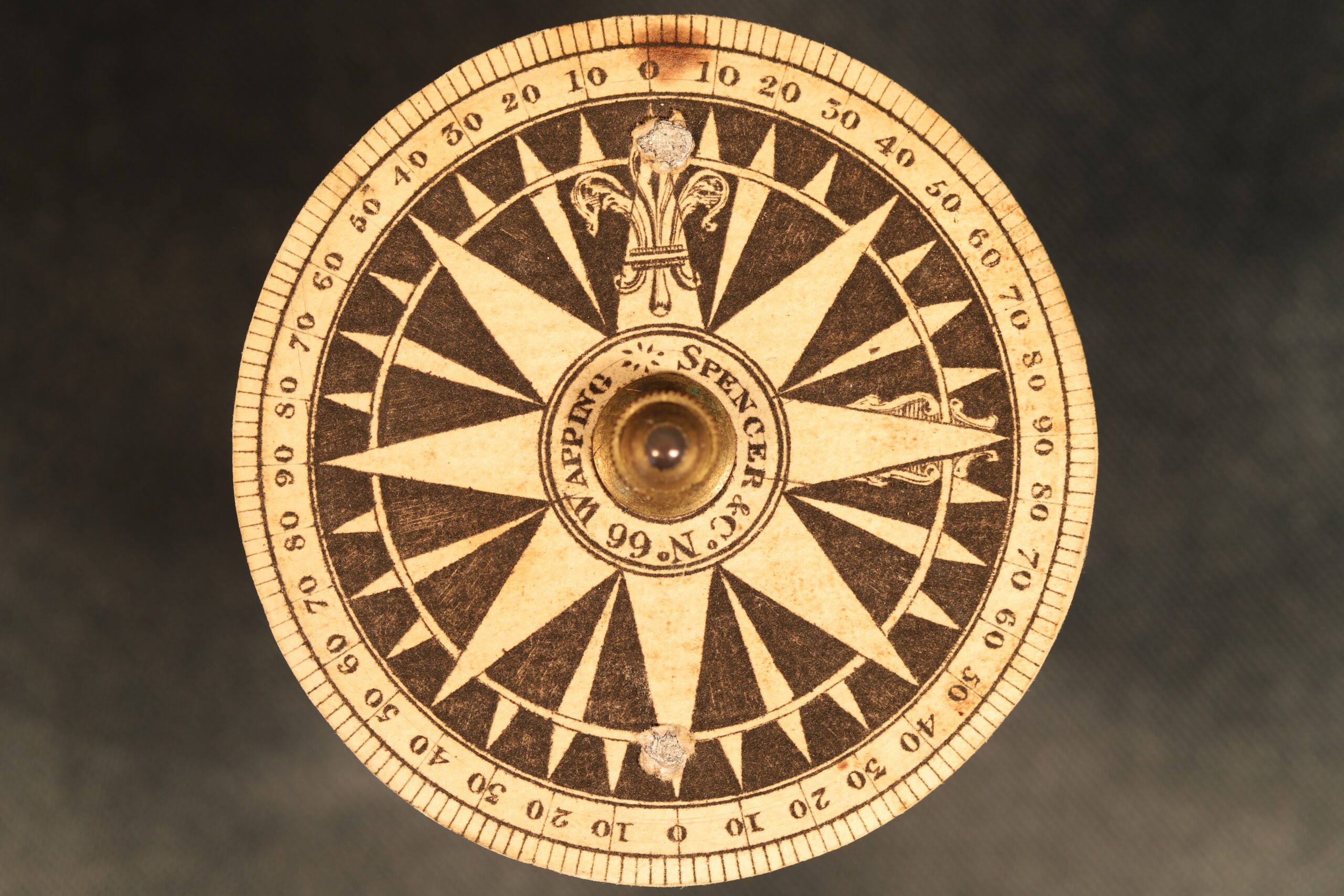 Rare English antique brass pocket compass comprising 2” floating quadrant card with nautical pattern, fleur-de-lys to North and decorated East point. Marked to centre by the maker “Spencer & Co, No 66 Wapping, London.” Heavy card suspended on jewelled pivot, the verso with magnetic bar affixed with twin iron rivets, wax balancing.