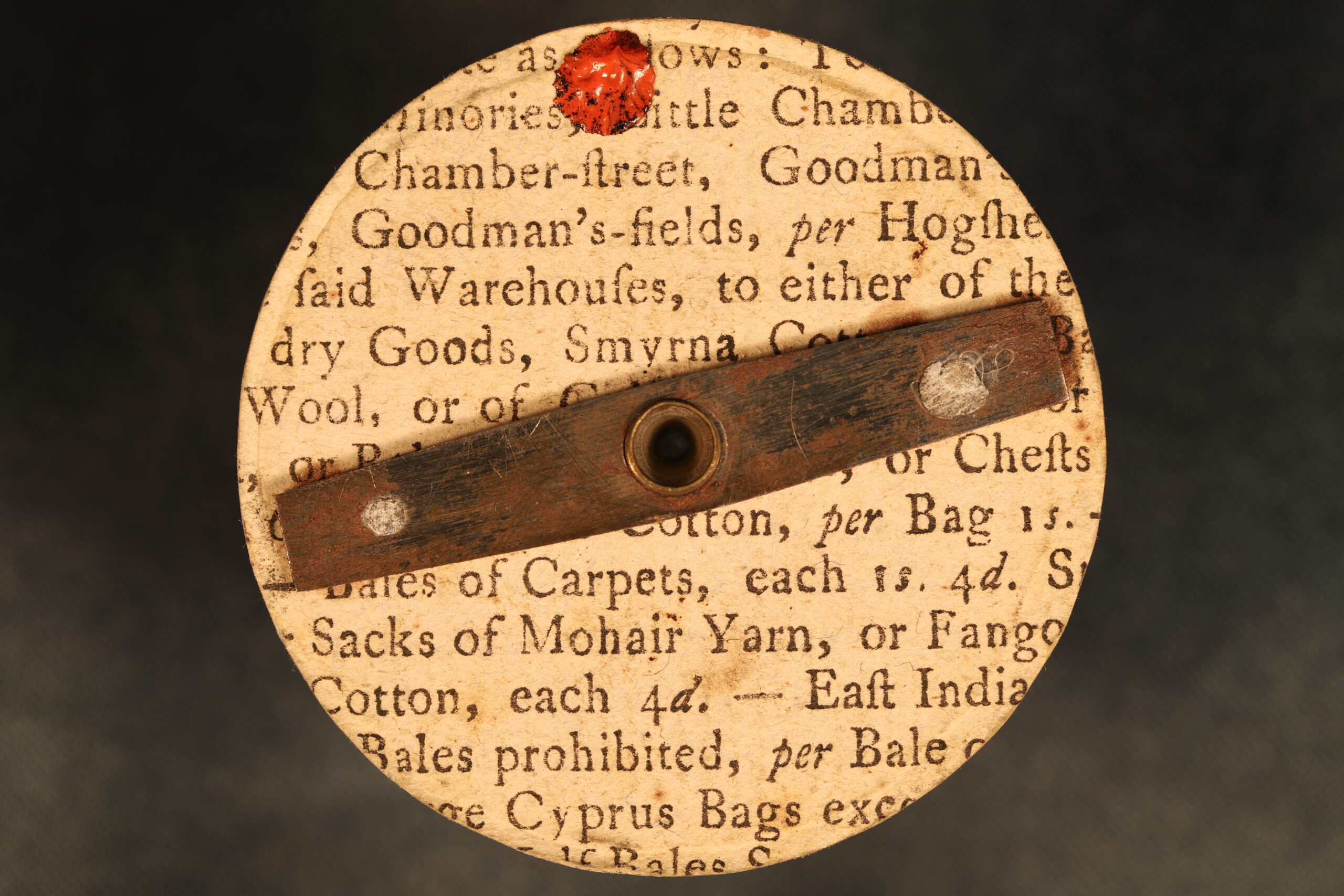 Comments: A very good example. It is rare to find both upper and lower parts to the outer case – mostly these are missing. It is noteworthy that these cards were almost all manufactured from re-cycled documents such as sales ledgers, in this case a ledger detailing commercial arrangements around Goodman’s Fields, only a mile or so from Wapping.